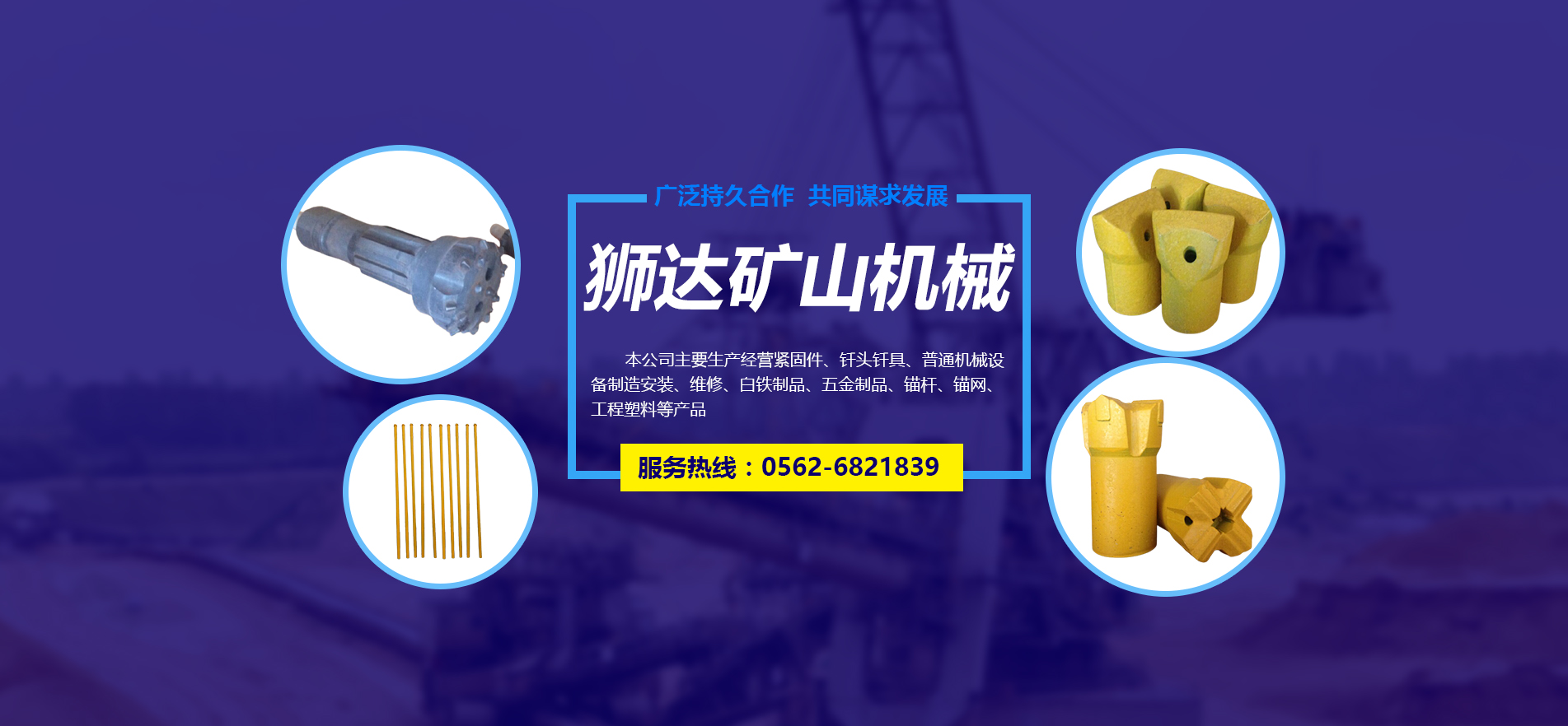 主營(yíng)緊固件、釬頭釬具、普通機(jī)械設(shè)備制造安裝、維修、白鐵制品、五金制品、錨桿、錨網(wǎng)、工程塑料等
